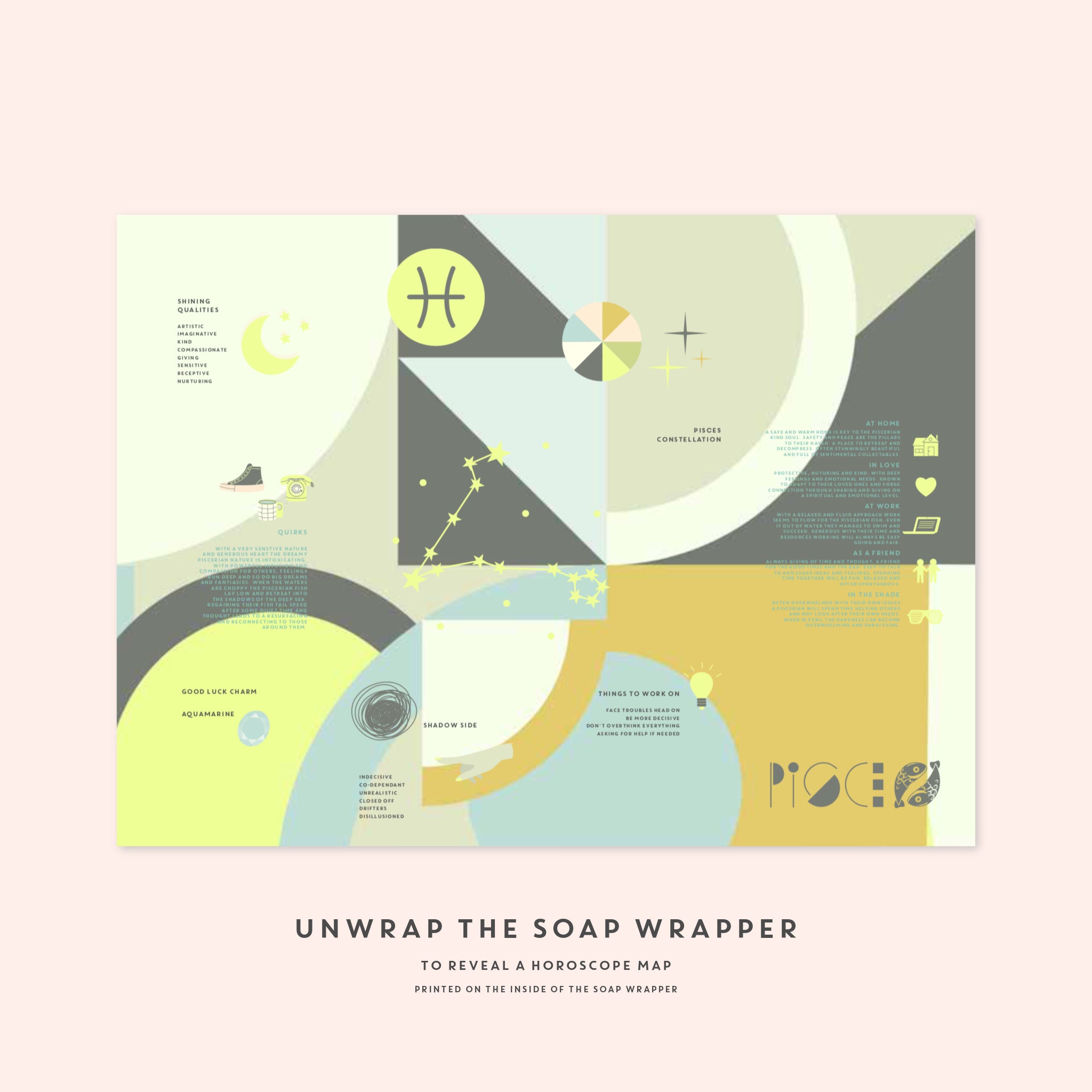 Unwrap the luxurious soap bar to reveal the Pisces horoscope map on the inside of the wrapper.
